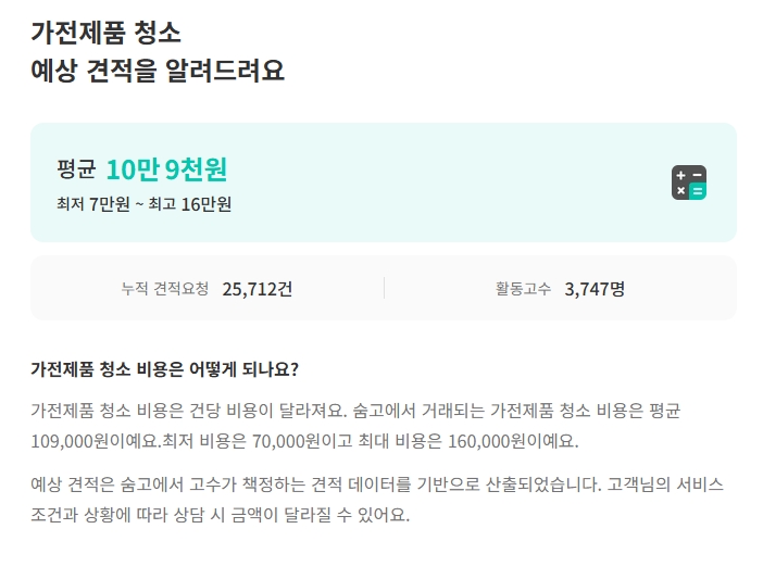 [1] 숨고 - 평균 가전제품 청소 비용을 알려드려요 (https://soomgo.com/prices/%EA%B0%80%EC%A0%84%EC%A0%9C%ED%92%88-%EC%B2%AD%EC%86%8C)