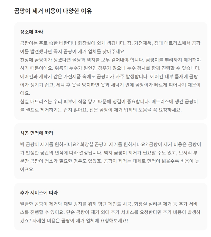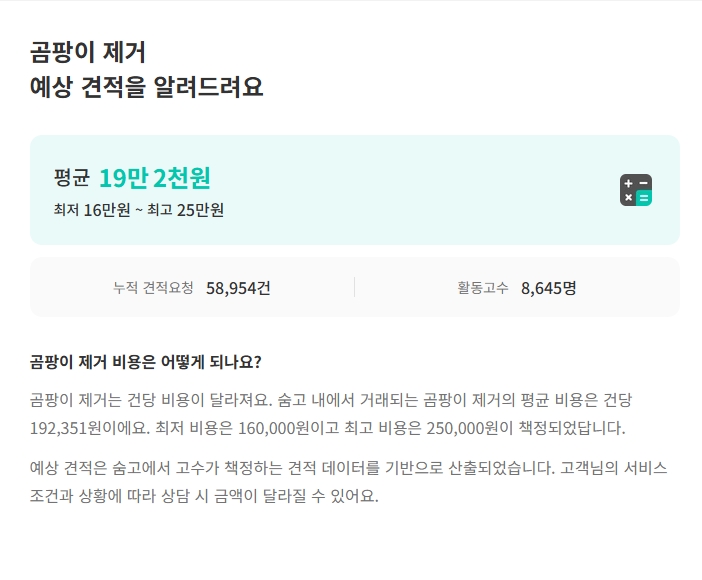 [1] 숨고 - 곰팡이 제거 평균 비용을 알려드려요 (https://soomgo.com/prices/%EA%B3%B0%ED%8C%A1%EC%9D%B4-%EC%A0%9C%EA%B1%B0)