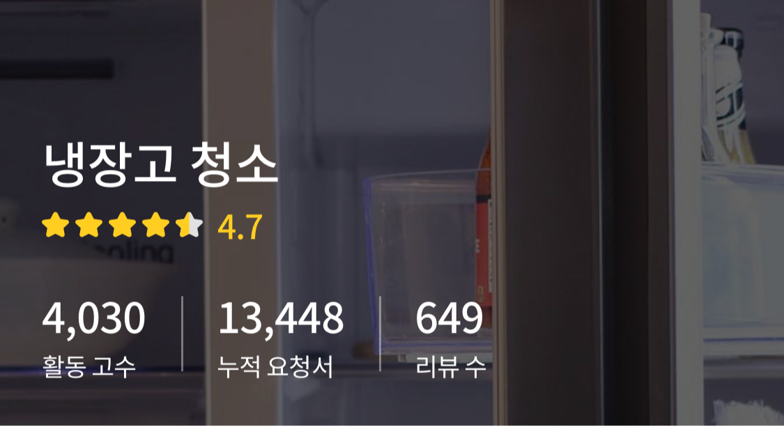 [1] 숨고 - 냉장고 청소 평균 비용을 알려드려요 (https://soomgo.com/prices/%EB%83%89%EC%9E%A5%EA%B3%A0-%EC%B2%AD%EC%86%8C)