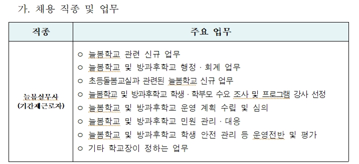 [3] 서울시교육청 교육공무직원채용 시스템 - 서울시교육청 늘봄실무사(기간제근로자) 채용 공고 (https://senworker.sen.go.kr/user/notice/detail.do?seq=660&pageNo=1)