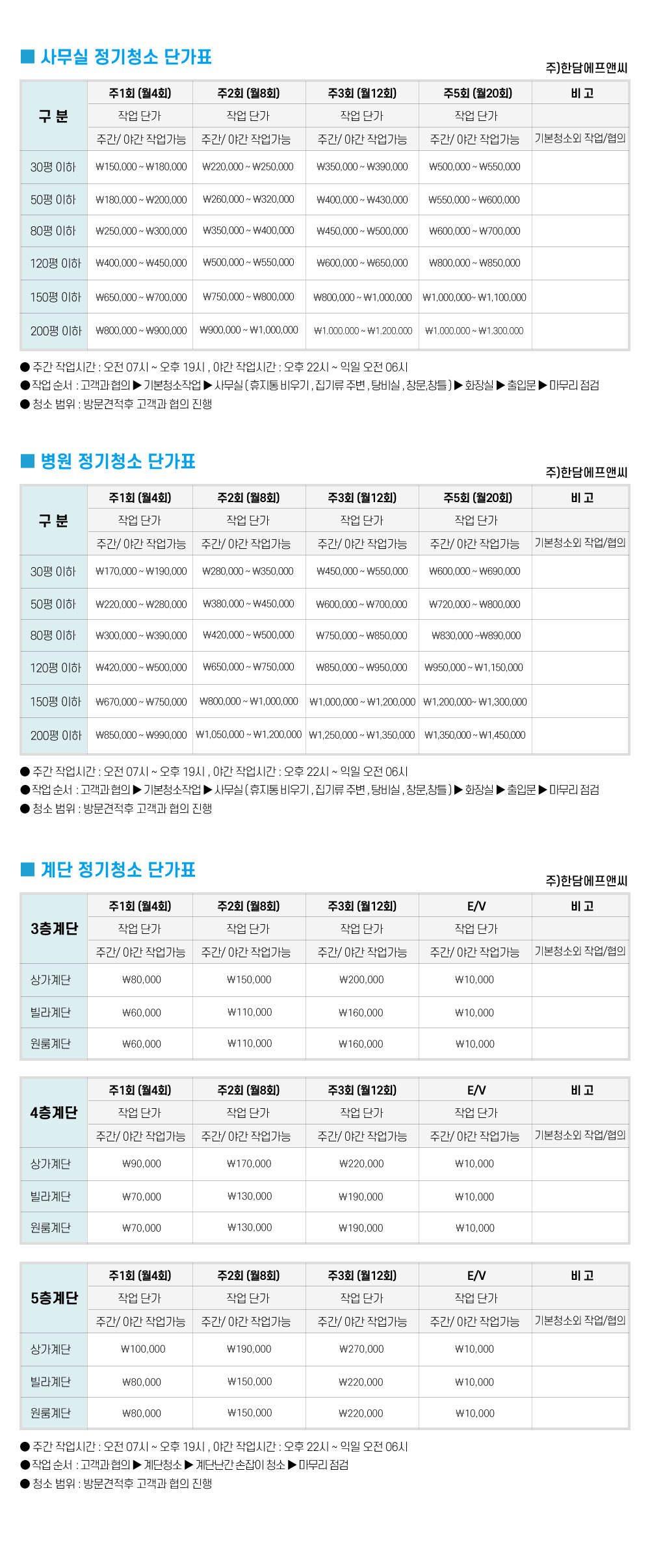 - 이사청소: 150,000원 ~ 530,000원 (사무실 크기에 따라)