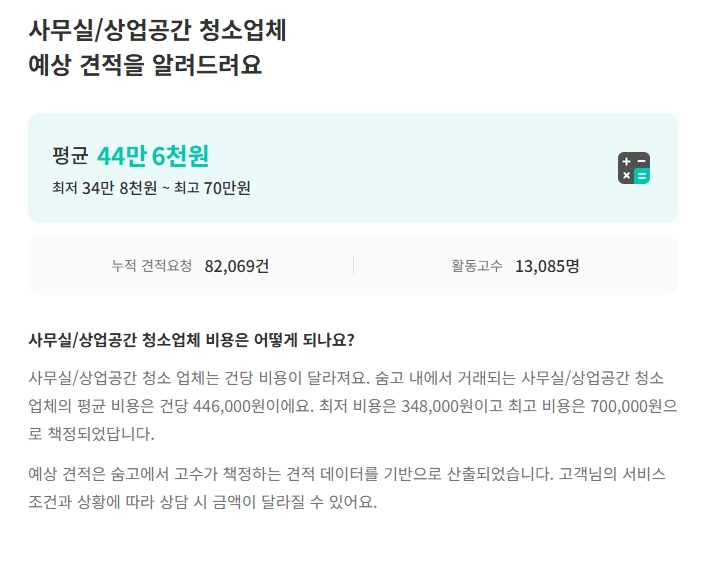 [3] 숨고 - 사무실/상업공간 청소업체 예상 견적을 알려드려요 (https://soomgo.com/prices/%EC%82%AC%EB%AC%B4%EC%8B%A4-%EC%83%81%EC%97%85%EA%B3%B5%EA%B0%84-%EC%B2%AD%EC%86%8C)
