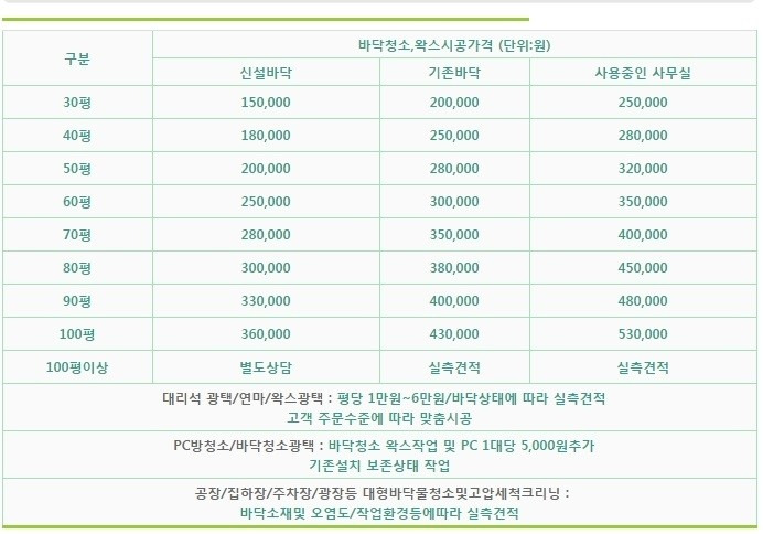 - 이사청소: 150,000원 ~ 530,000원 (사무실 크기에 따라)