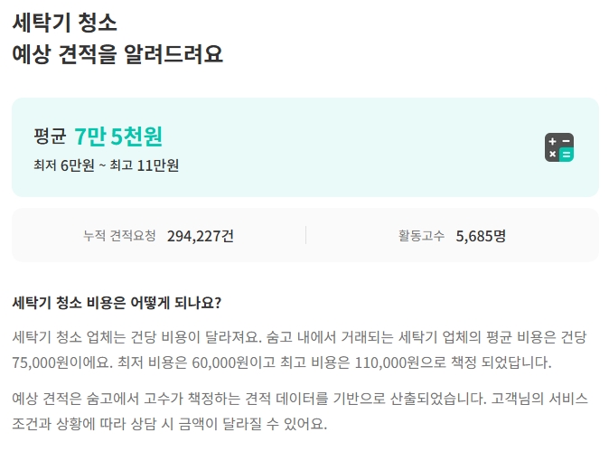 [2] 숨고 - 세탁기 청소 평균 비용을 알려드려요 (https://soomgo.com/prices/%EC%84%B8%ED%83%81%EA%B8%B0-%EC%B2%AD%EC%86%8C)