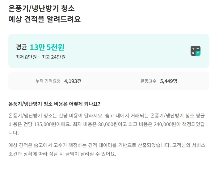 [1] 숨고 - 에어컨 청소 예상 견적을 알려드려요 (https://soomgo.com/prices/%EC%97%90%EC%96%B4%EC%BB%A8-%EC%B2%AD%EC%86%8C)