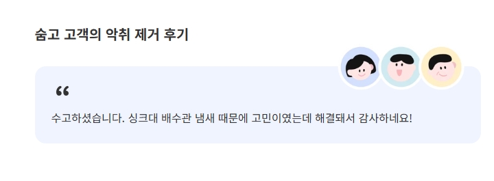 - 배수구 청소 : 배수구에서 나는 악취를 제거하는 서비스로, 전문 장비를 사용해 청소해요.