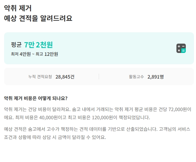 악취 제거 서비스의 비용은 여러 요인에 따라 달라져요. 일반적으로는 다음과 같은 가격대가 형성되어 있어요: